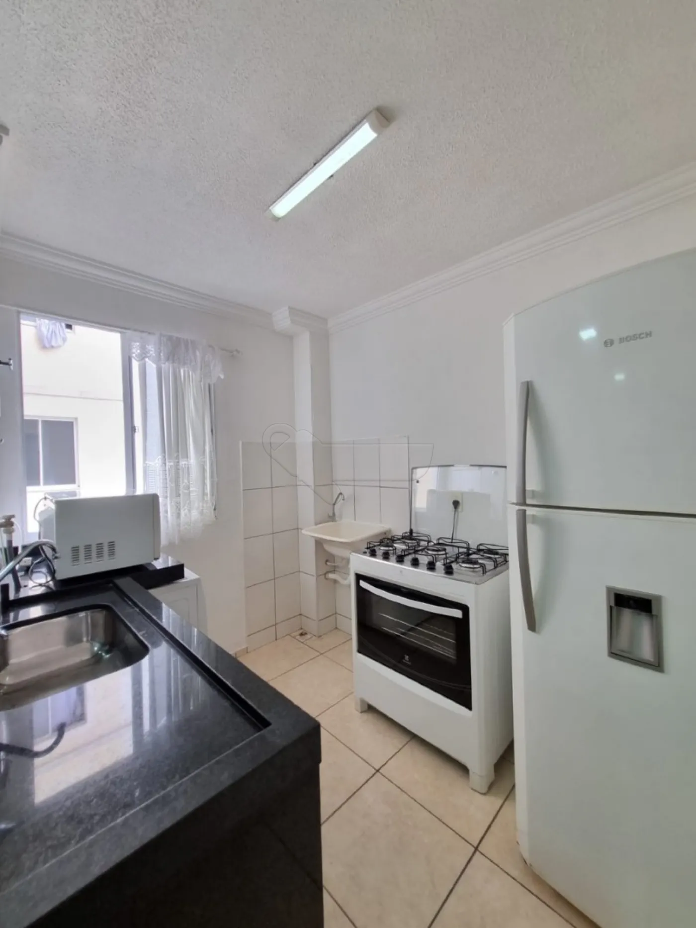 -Cozinha equipada com micro-ondas, geladeira e fogão