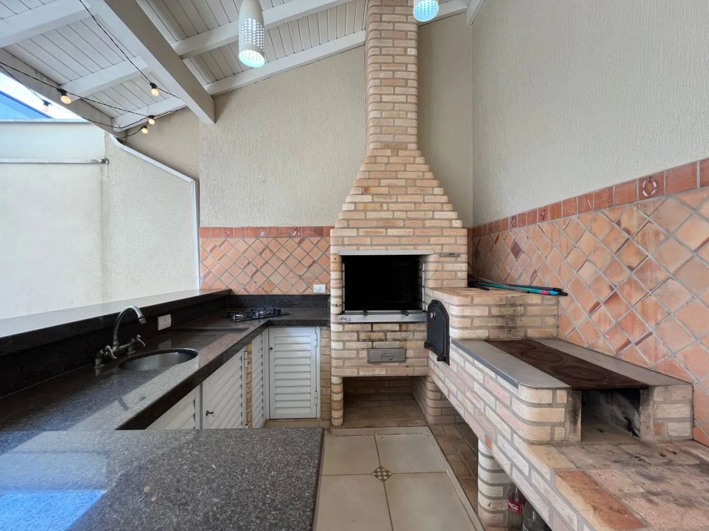 Área gourmet com churrasqueira, fogão e forno a lenha