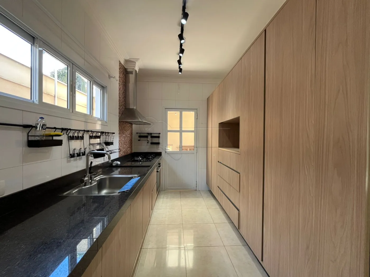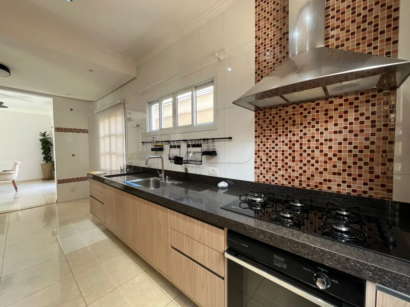 Cozinha completa com armários planejados, fogão, forno e coifa