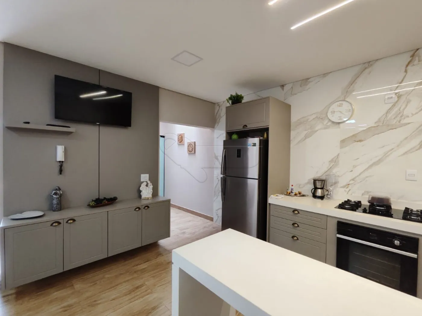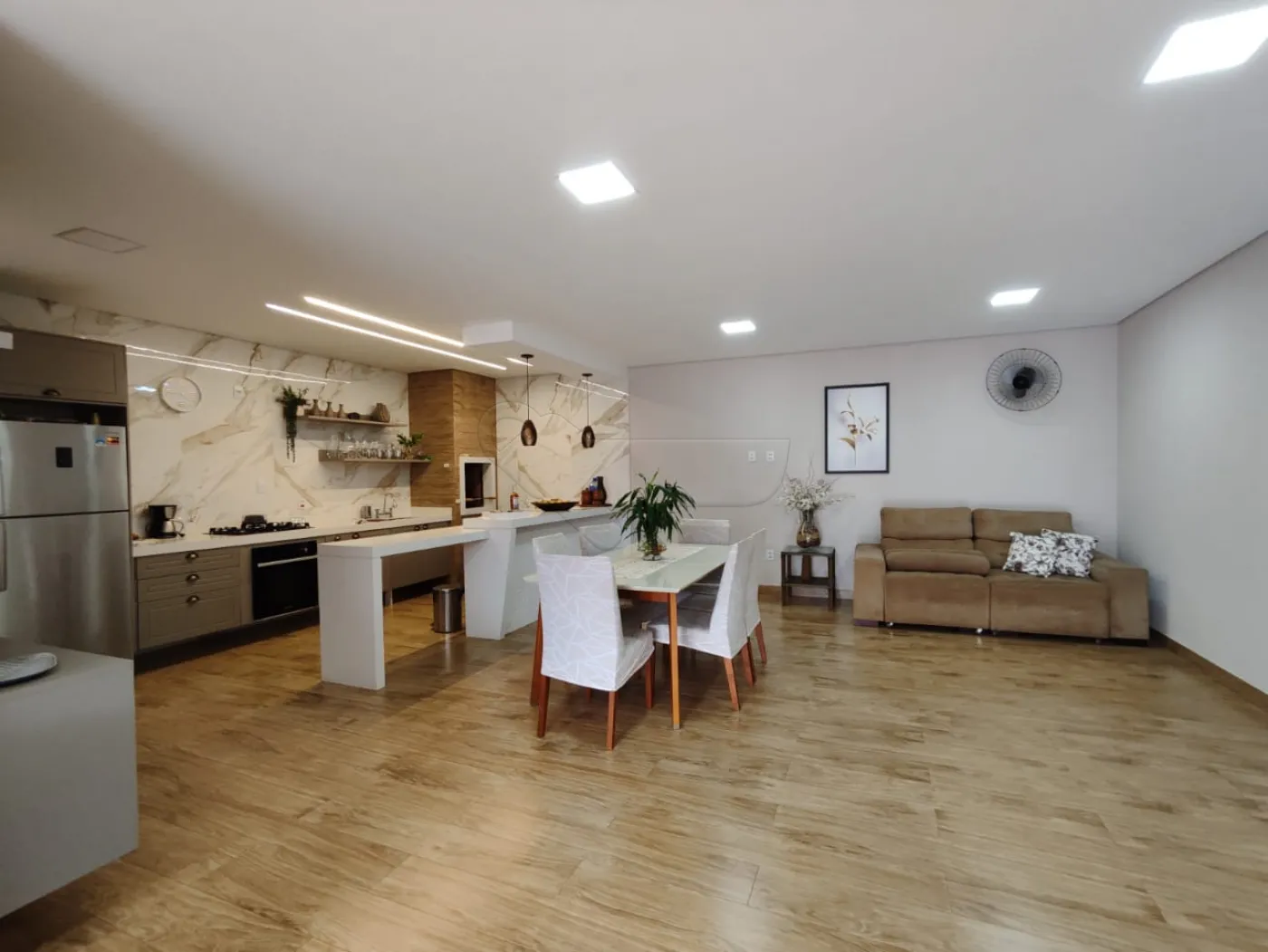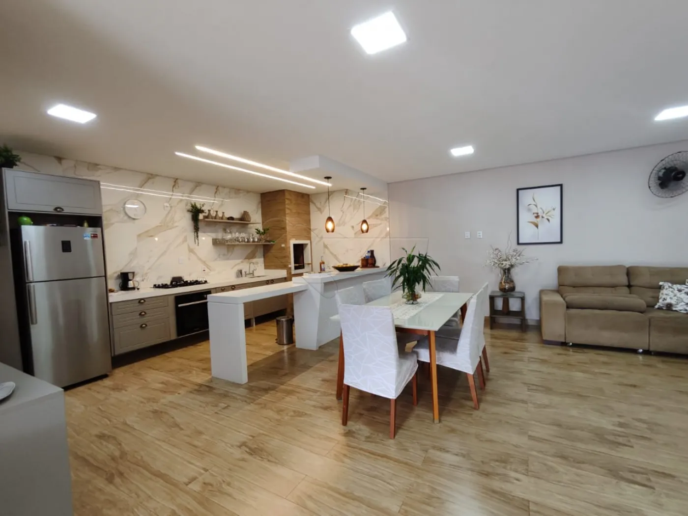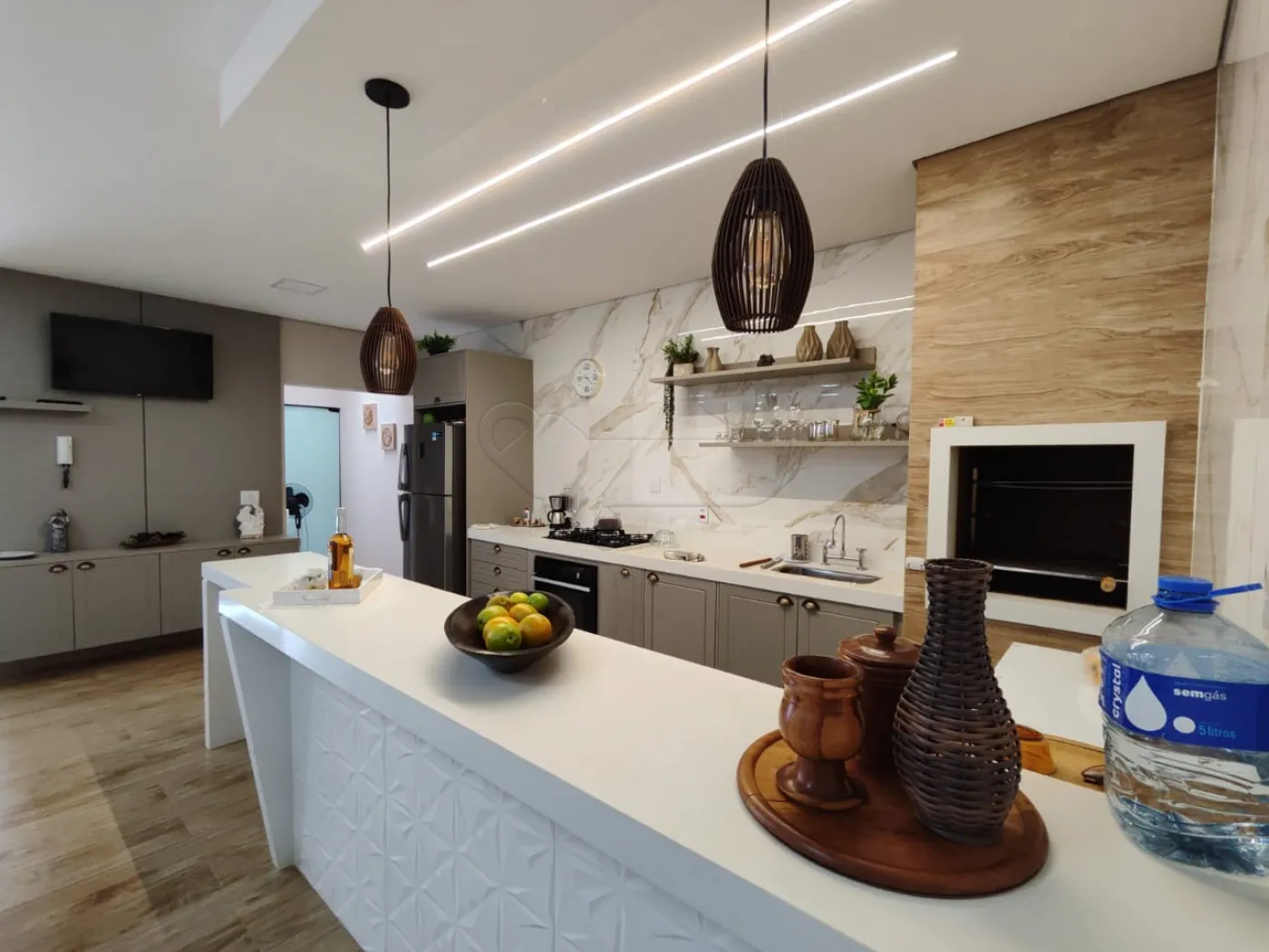 -Sala de estar integrada com cozinha gourmet.