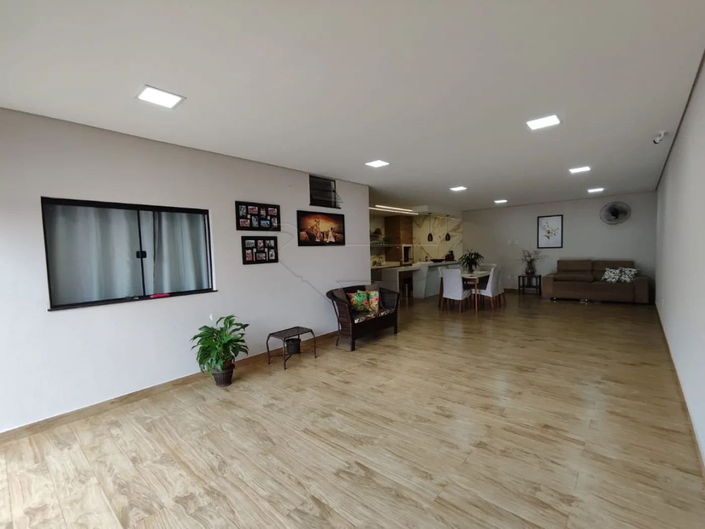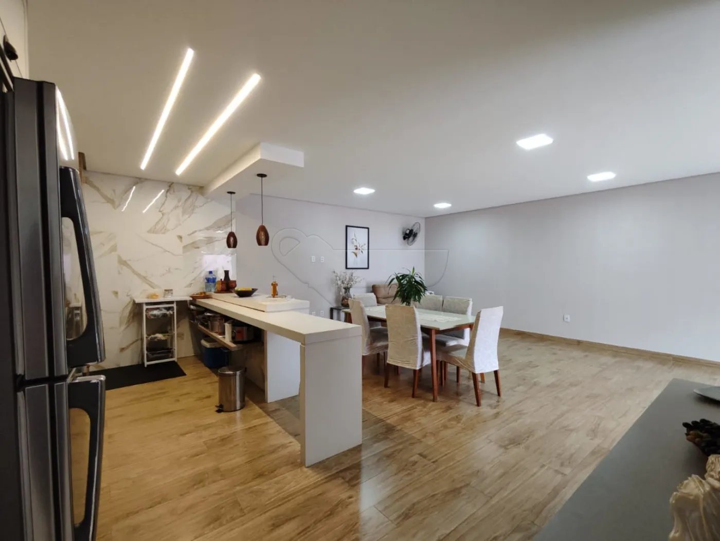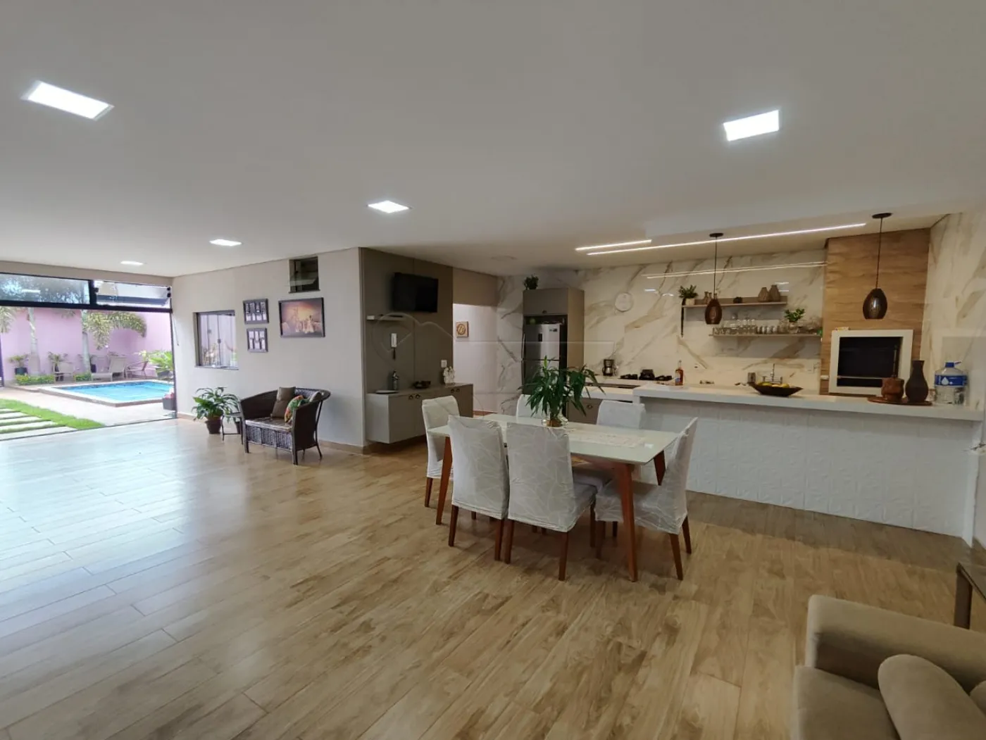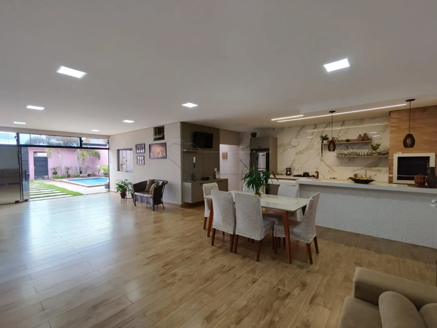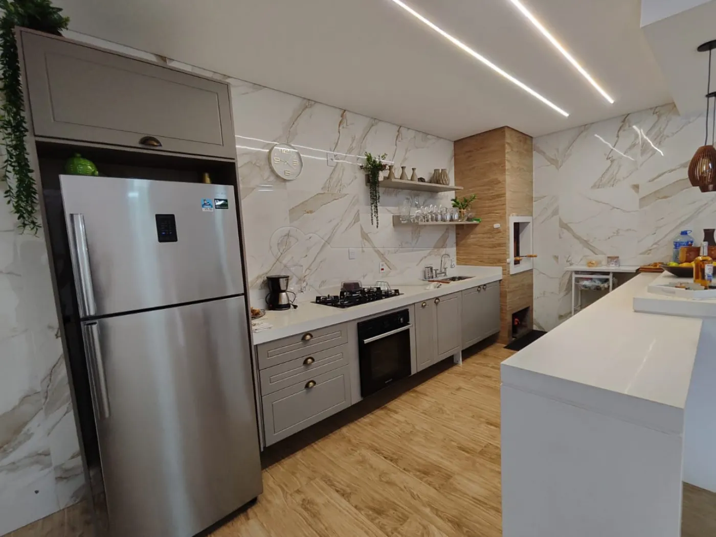 -Sala de estar integrada com cozinha gourmet.