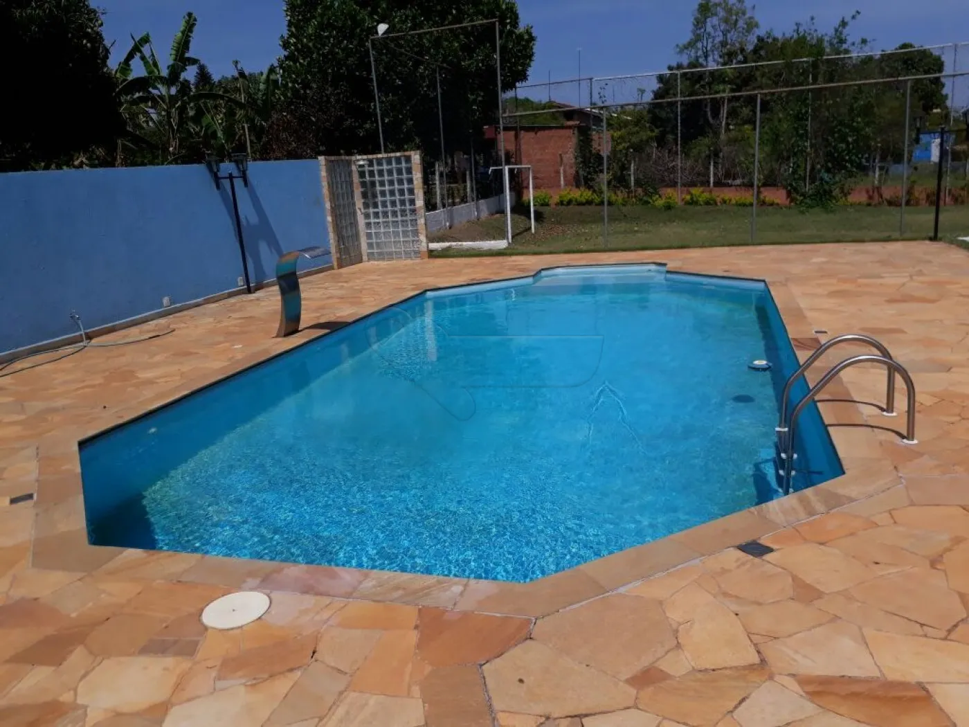 PISCINA COM 50 MIL LITROS DE ÁGUA, AZULEJADA, COM ILUMINÇÃO, CASACATA E DUCHA;